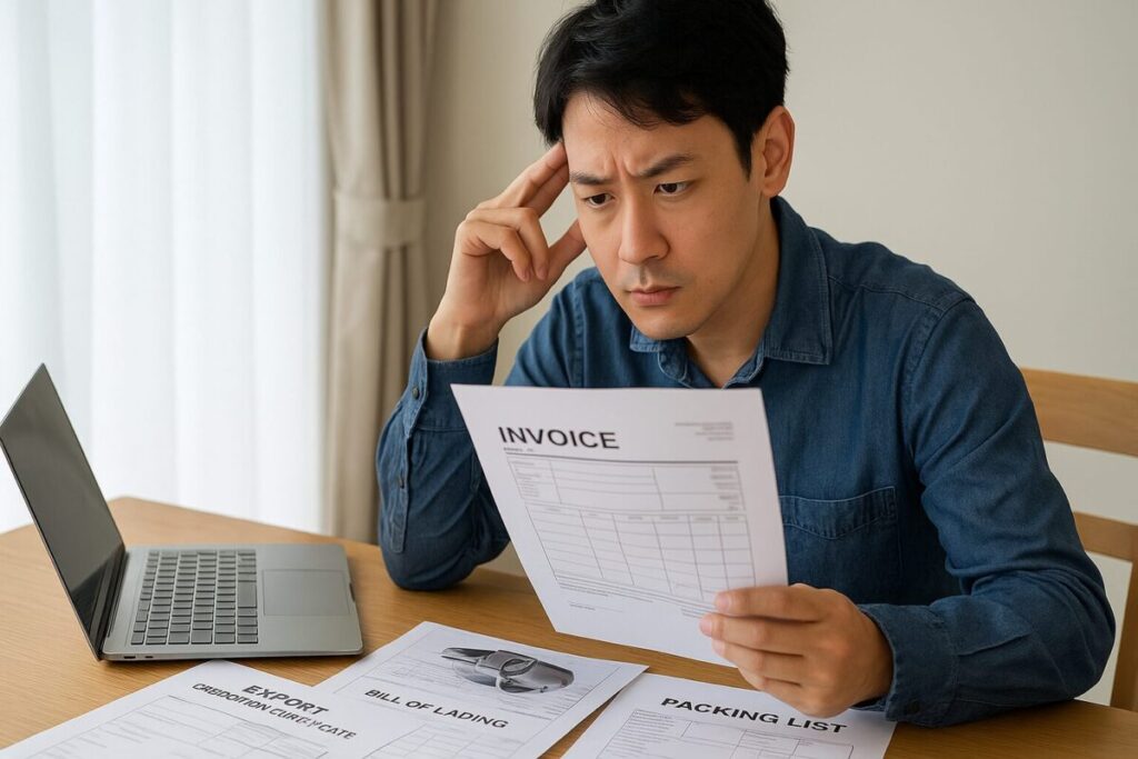 書類は第三者チェック推奨。品名や車台番号のタイポ一つでも差し戻し対象です。電子データ・原本・翻訳(必要国)をセットで管理しましょう