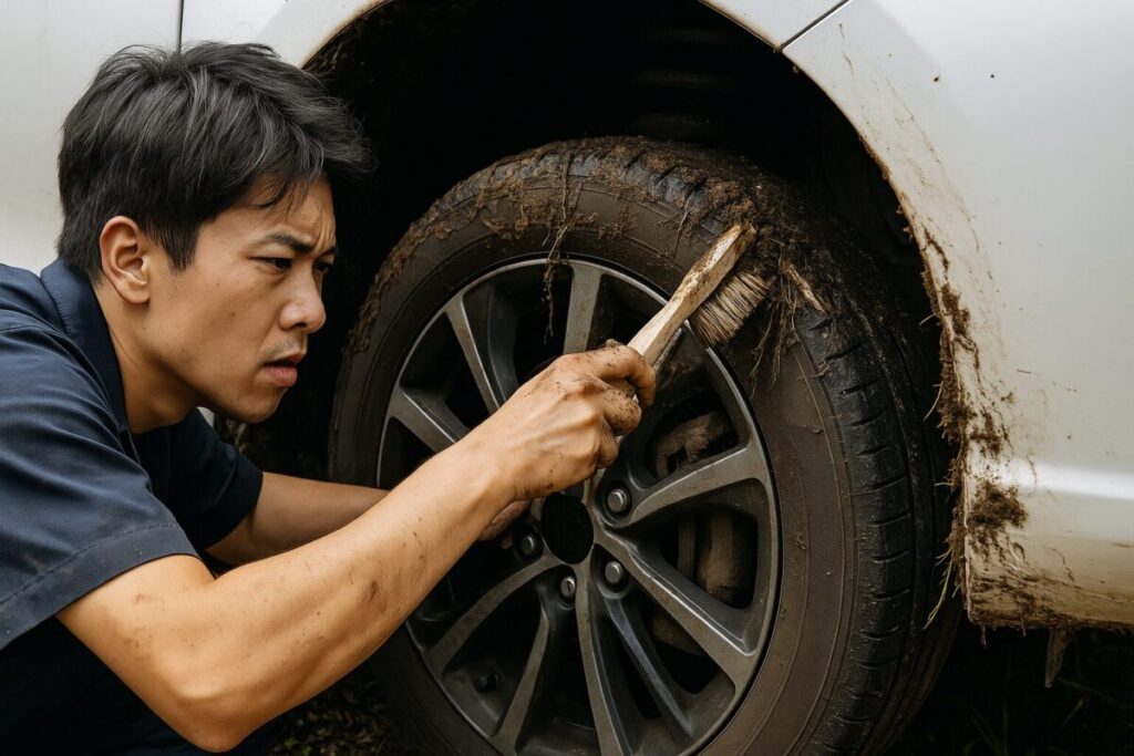 検疫が厳しい国向けは、下回り・サスペンション周り・ホイールハウスに付着した土や植物片の除去がマスト。車内も落ち葉や種子まで徹底的に掃除します。